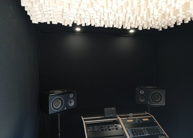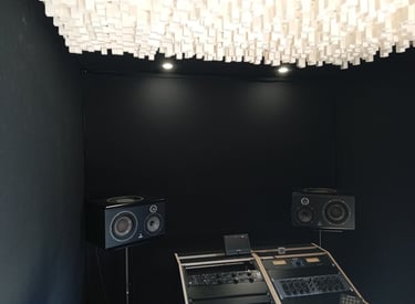 Une cabine de mastering dédiée pour un son exceptionnel. Pièce traité acoustiquement grâce au service de consulting et aux calculs de storm mastering.